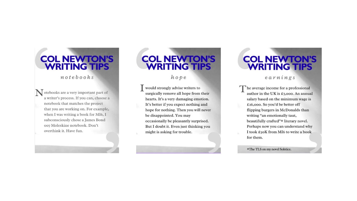 People seemed to like them. They made Col seem like a person in his own right, someone who existed outside of the pages of my novel. So much so that when I googled ‘who is writer Col Newton?’, the AI overview informed me: ‘Col Newton is a writer and blogger known for sharing “writing tips” and humorous, often eccentric, insights on the craft, appearing in contexts related to author Roger Morris. He focuses on aspects like elevator pitches, writing rituals, and the psychology of creativity, often sharing these via Instagram.’